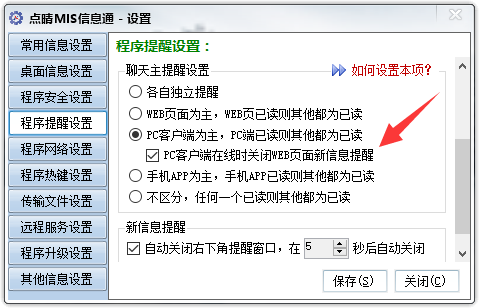 2、如果长期在办公室操作OA,那么应该设置为“PC客户端为主,PC端已读则其他都为已读”,此情形下,就算WEB页面和手机APP已读,PC客户端还是会弹出未读提醒,为避免WEB端干扰工作,可以勾选“PC客户端在线时关闭WEB页面新信息提醒”;