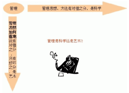 我们学校里、书本里学到的各种思想、方法,是有对错之分的,是科学。这是管理在横向上的维度。另外,我们的思想和方法如何真正落地,管理的推行过程却是没有对错之分的,只有好坏之分,这是管理在纵向上的维度,是艺术。