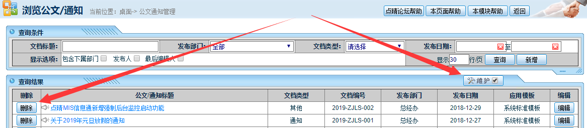 :已发布的公文/通知发现错误需要修改或删除(撤回)怎么办?![]() ![]() 以网管身份登录OA,在公文通知查询页面,点击维护,就会看到删除和编辑按钮,要么彻底删除,重新发布;要么编辑已经发布的公文,可以勾选重新通知知会人。