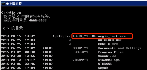 如上图,aegis_inst.exe对应的短文件名为aegis_~1.exe。根据此特性,我们能够通过访问短文件名间接访问它对应的文件。