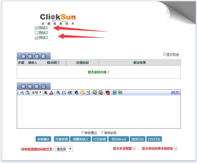 测试过,程序没有问题,是你的模板设计有问题,下面是审核时看到的复选框,可以正常显示勾选效果: