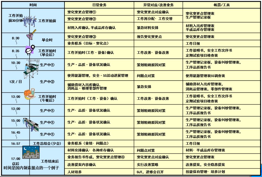 现场领导人的职责:为了达成事业计划目标,持续性的实行对工作岗位的「管理」和「改善」在制造现场正确的进行标准作业时,以工序管理图(QC工序图)・品质管理标准・安全标准等为基础,确保「Q・C・D・安全」等的正常运行,对各种作业方法及条件进行标准化的总称根据劳动安全卫生法等,企业担负着确保属下安全劳动的义务。同时企业制定相应的安全规则等「安全标准」,工作人员必须并有义务履行这个义务。以劳动基准法为依据而制成的,是工作人员应尽的义务,在工作岗位工作时,必须要遵守公司规定的「上下班时间,休息时间,节假日,休假,报酬等,还有服装及行为举止,安全卫生,职业训练等」。式样变更联系的确认及4M(人・设备・材料・作业方法)准备确认讨论缺勤发生的对策,配置预备人员,判断作业分配的变更作业分配变更时的作业说明书准备,确认指导者・确认者及联系属下变化变更点管理③【确认属下情况】 (Man),业务联系其他,品质投诉,品质重要事项,来自公司的各种联系等必须要告知全员。在作业开始前,指导属下对【作业说明书】【安全作业次序书】进行确认如果使用材料,工夹具,作业次序与【作业说明书】不符的话,则一定不能开始作业针对指定的设备・夹具,要根据「日常检查项目确认表」,指示负责人进行确认,发生异常时要采取修补措施