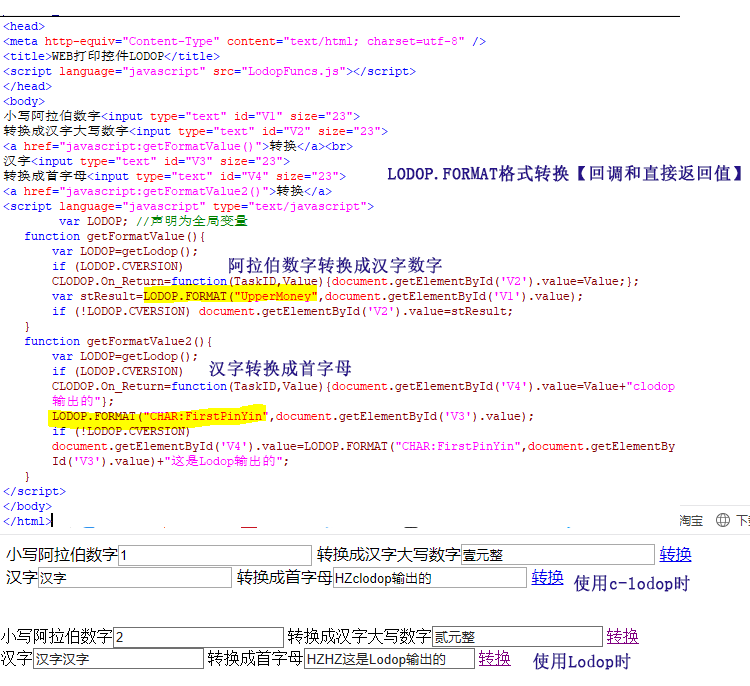 Lodop中有一些格式转换函数,这些函数和其他众多函数一样,c-lodop需要使用回调函数On_Return返回,Lodop插件方式直接返回,通常混合部署,写法要兼容两个控件