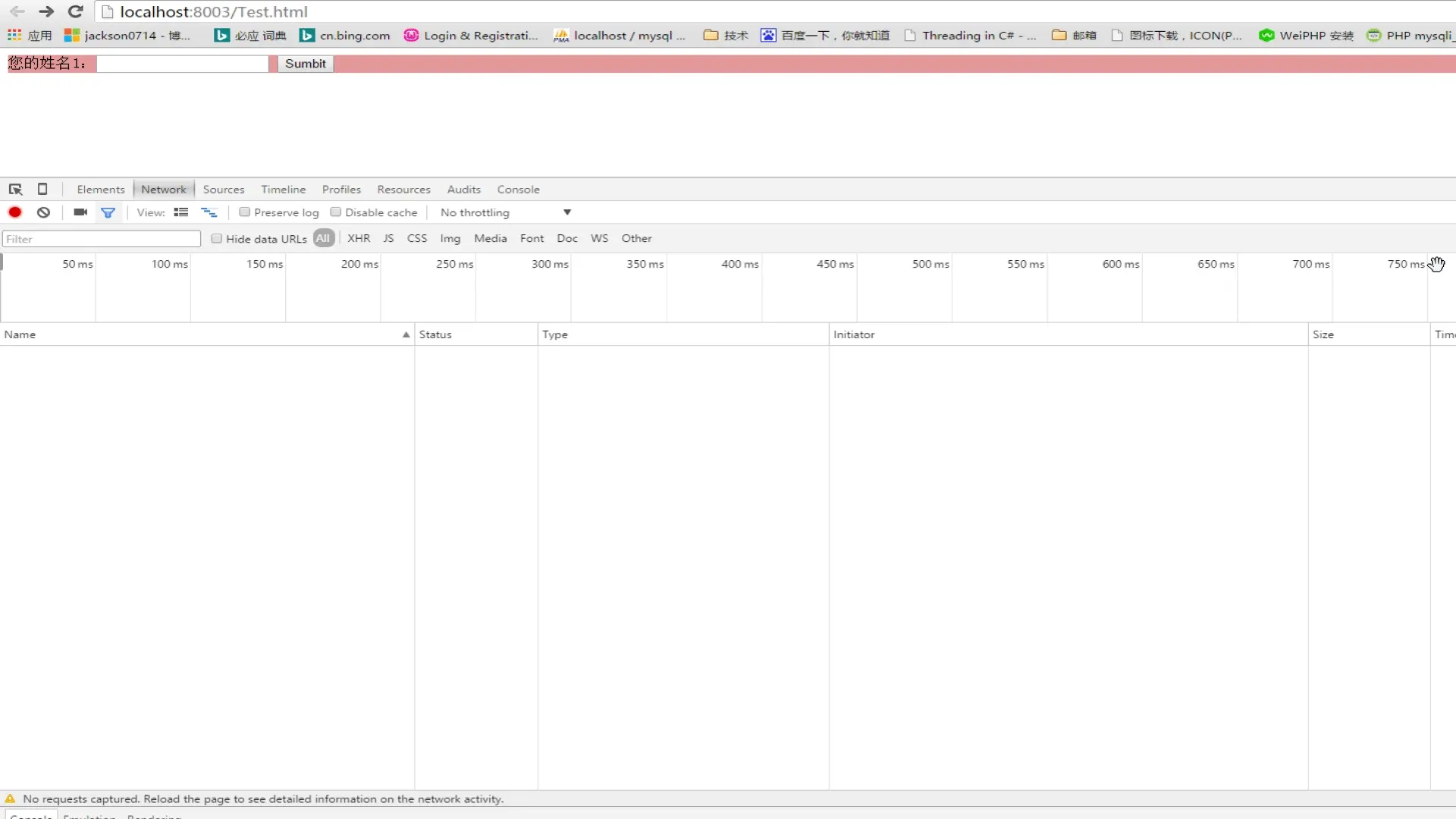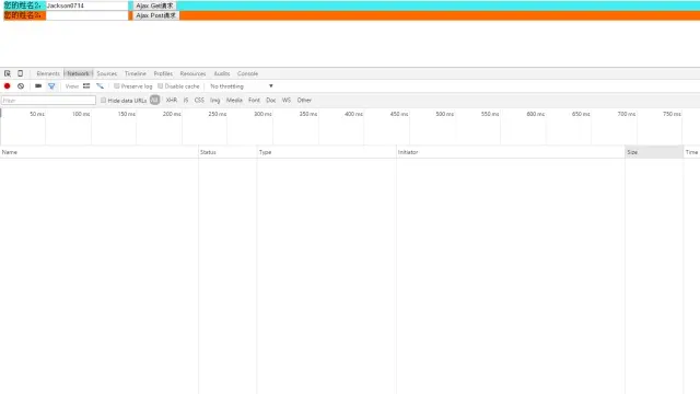 <!DOCTYPE html> <html lang="en" xmlns="http://www.w3.org/1999/xhtml"><head>    <meta charset="utf-8" />    <title></title>    <script type="text/javascript" src="Ajax.js"></script> </head><body>    <div id="Test" style="background-color:#40eeee">        您的姓名2:<input type="text" id="testGetName" size="20" />        <button type="button" onclick="testGet();">Ajax Get请求</button>    </div>             <div id="Test" style="background-color:#ff6a00">        您的姓名3:<input type="text" id="testPostName" size="20" />        <button type="button" onclick="testPost();">Ajax Post请求</button>    </div>      <div id="myDiv" /> </body></html>