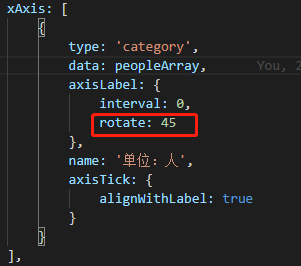 此时,想到axisLabel还有一个属性rotate,它用来控制刻度标签旋转的角度,在类目标签显示占不下的时候可以通过旋转防止标签之间的重叠。旋转角度从-90度到90度。