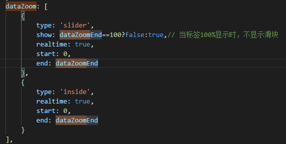 为了更好的客户体验,inside和slider方式同时使用,在option里面加上dataZoom组件,代码如下: