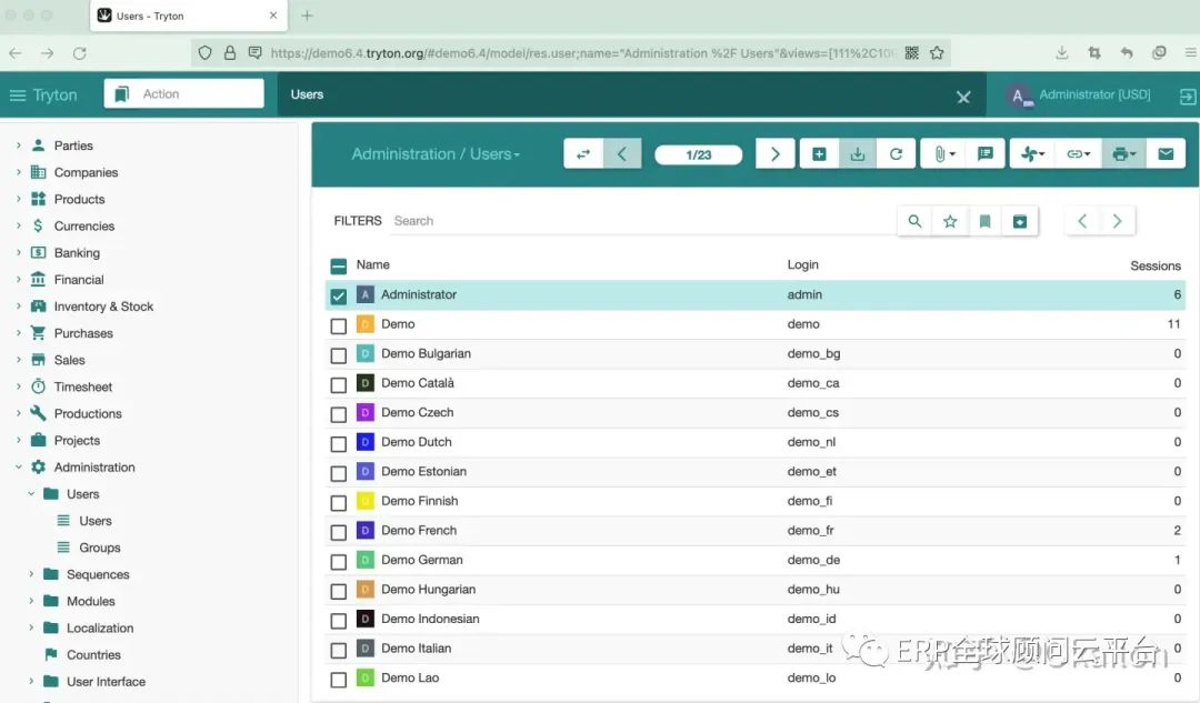 图2:ERPNext销售订单界面 1)功能特点: ERPNext提供了一系列的模块,涵盖多个业务领域,包括会计、库存管理、销售、采购、人力资源等。 具备仪表板和报告功能,使用户能够实时监控业务绩效。支持多语言和多货币。提供移动端应用,方便用户在移动设备上访问系统。 2)技术栈: ERPNext主要使用Python编写,基于Web框架Frappe Framework。使用MariaDB作为默认的数据库管理系统。前端采用Javascript和jQuery。 3)模块化设计: ERPNext的模块化设计使得用户可以根据其业务需求选择性地启用不同的功能模块,从而定制系统以满足特定的业务流程。 4)部署方式: 用户可以选择在本地服务器上部署ERPNext,也可以使用云服务进行部署。ERPNext提供了Docker镜像,简化了部署过程。 5)开源许可: ERPNext采用GNU通用公共许可证(GNU General Public License,GPL)。 NO3.Tryton ERP Tryton是一款开源的企业资源计划(ERP)软件,旨在提供一套灵活、模块化和可扩展的解决方案。