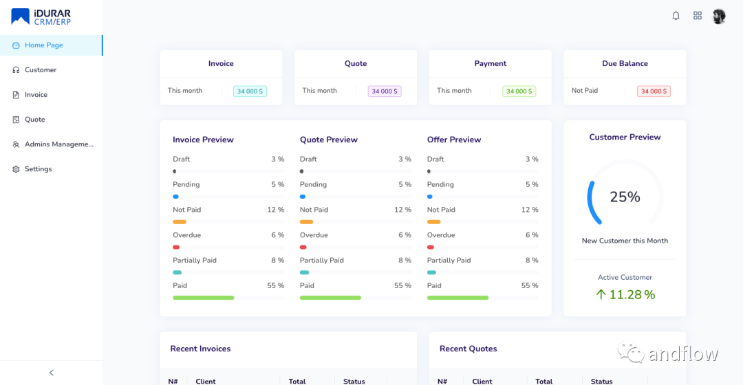 1)功能丰富:Metasfresh包含了多个功能模块,涵盖了财务、销售、采购、库存、生产制造、人力资源等多个业务领域。它提供了全面的ERP解决方案。 2)开源许可:Metasfresh是一个开源项目,采用GNU通用公共许可证(GNU General Public License,GPL)。这意味着用户可以自由使用、修改和分发软件。 3)技术栈:Metasfresh的后端主要使用Java编写,前端采用了Angular框架。它通常使用PostgreSQL数据库作为数据存储后端。 4)模块化设计:Metasfresh采用模块化的设计理念,用户可以选择性地启用或禁用不同的模块,以满足其特定的业务需求。这也使得系统更加灵活和可扩展。 5)系统界面:Metasfresh的用户界面被设计为直观、现代且易于使用。用户可以通过Web浏览器访问系统,执行各种任务。 6)云集成:Metasfresh支持云集成,用户可以选择在云服务上部署系统。这提供了更灵活的部署选项,特别适用于不想承担自己服务器管理的企业。 NO8.Ever Gauzy ERP Ever-Gauzy的功能主要包括:会计管理、库存管理、生产管理和人力资源管理等。它还提供了一个移动的应用程序,供随时随地访问。 ![]() 图8:Ever Gauzy ERP系统界面 功能特征: 包括一个全面的人力资源管理模块,具有员工入职、工资管理和绩效跟踪功能。内置项目管理工具使企业能够有效地管理和跟踪他们的项目。 NO9.IDURAR ERP 更多信息:IDURAR Open Source ERP CRM · GitHub IDURAR是一个开源的ERP、CRM系统,其主要功能包括:发票、库存、会计、人力资源等业务管理,系统基于Node.js、MongoDb、React.js开发,支持定制化。