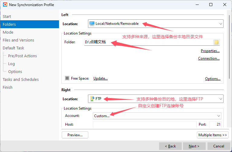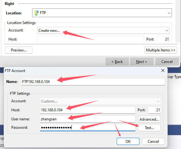 Left:备份来源,Location支持很多种,这里选择本地目录“Local/Network/Removable”,Folder选择准备备份的本地目录; Right:备份目的地,Location也支持很多种,这里选择“FTP”,Account选择“Create new...”: