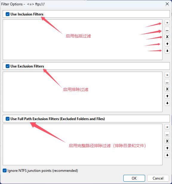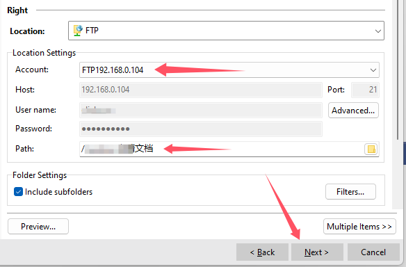 然后在Path中选择FTP服务器上的目的备份文件位置,如果没有合适的目录,那么可以立即创建一个新的目录用于同步备份。 如果有一些文件不想备份,那么可以点击“Filter...”,设置过滤条件(具体设置方法自行测试体会):