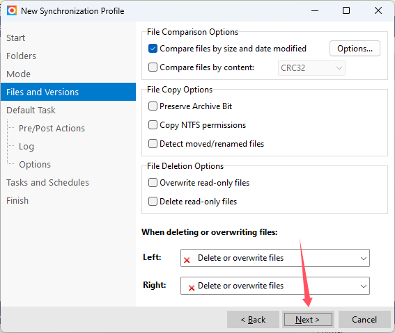 上面是设置同步备份方法,建议按照以上设置即可。 Mode选择“Simple”简单备份方式; Left and Right(备份来源和目的地): File exists on Left only,选择“Copy from Left to Right”,意思是如果文件只在左边存在时,则从左边复制到右边; File exists on Right only,选择“None(skip file)”,意思是如果文件只在右边存在时,则跳过,什么也不做; File exists on Left and Right, and are different,选择“Always copy from Left to Right”,意思是如果文件在两边都存在并且不同时,则永远只从左边复制到右边; File exists on Left and Right, and are the same,选择“None(skip file)”,意思是如果文件在两边都存在并且相同时,则跳过,什么也不做; 7、然后点击“Next”