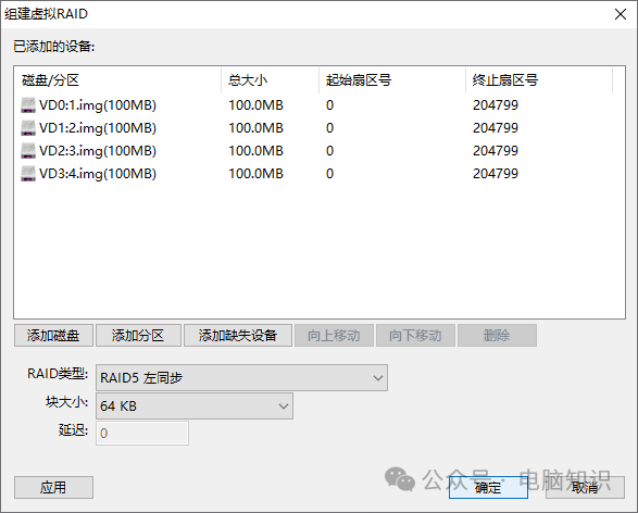 步骤二:当"组建虚拟RAID"对话框弹出后,可以点击"添加磁盘"来添加硬盘,并设置硬盘顺序、RAID类型、块大小、延迟参数等。最后点击"确定"按钮。