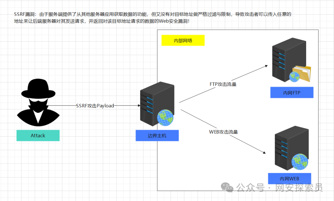 1.访问内部资源:攻击者通过在目标应用程序中构造恶意请求,使其发起针对内部网络的请求。