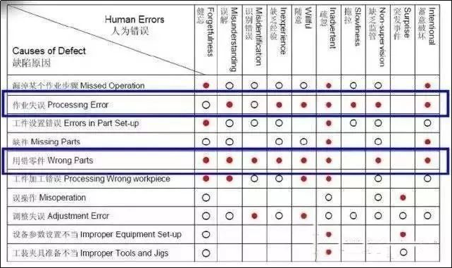 防错,日文称POKA-YOKE,英文称Error Proof 或 Fool Proof(防呆)。这里为什么提到了日文?小编想从事汽车行业或制造行业的广大朋友一定知道或听说过丰田汽车公司的丰田生产方式(TPS)。POKA-YOKE的概念是日本质量管理专家、丰田生产体系创建人新乡重夫(Shingeo Shingo)首创,并将其发展成为用以获得ZD零缺陷,最终免除质量检验的工具。从字面上看,防错,就是防止错误的发生。要想真正了解防错,我们先来看看“错误”及“错误”为什么会发生?“错误”造成与预期的偏离,最终可能产生缺陷,很大一部分原因是人们由于疏忽、无意识等造成的。对于制造业来说,我们最担心的就是产品缺陷的产生,而“人机料法环”都有可能导致缺陷。人为的错误不仅存在,无法完全避免。另外,人为错误还会影响机、料、法、环、测等因素(毕竟事情都是人做的,人的情绪总有某一刻的不平稳,没法完全独立),比如加错料了。所以“防错”这个概念就应运而生了,其诞生的很大一部分意义就是与人(人为错误)做斗争(我们一般不去谈设备、物料犯错误)。遗忘、理解错误、识别错误、新手错误、意愿错误、疏忽错误、迟钝错误、缺乏标准导致的错误、意外错误、故意的错误。1. 遗忘:当我们注意力不集中在某处时,会遗忘某些事情。2. 理解错误:我们常根据以前的经验来理解新遇到的事物。3. 识别错误:看得太快、看不清楚或者没仔细看会发生错误。4. 新手错误:缺乏经验产生的错误,比如老员工一般比新员工少犯错误。5. 意愿错误:特定时候决定不采纳某些规则发生的错误,比如闯红灯。6. 疏忽错误:心不在焉发生的错误,比如无意识的穿过街道,没有留意到红灯是亮着的。7. 迟钝错误:判断或者行动迟缓发生的错误,比如刹车踩慢了。9. 意外错误:没有考虑到的情况导致的错误,比如某个检验设备突然故障了。10. 故意错误:人为的故意制造错误,这个性质就恶劣啦~以上这些分类有些分散,之间也有重叠交叉的地方。但无非是技能、规则和知识导致的错误。如果再要小编总结一下,可以考虑发生这些原因的原因,那就是人的惰性,所以这也是“防错”所要达到的目标。不管生产什么零件,这些错误可能给生产带来以下后果:在很长一段时间,被各大公司所采用的防止人为错误的主要措施是“培训与惩罚” 。
