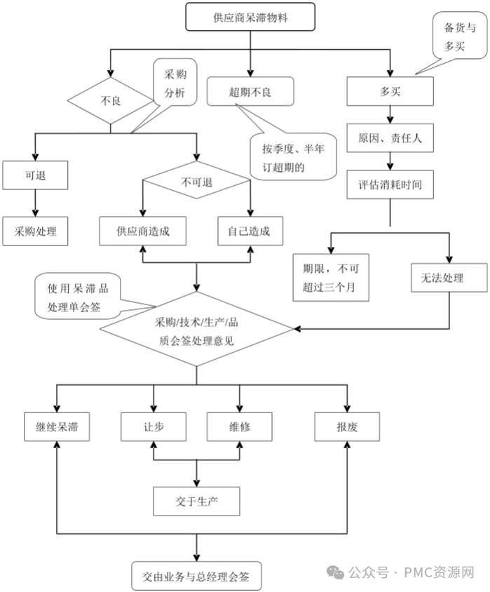 4.4.3 供应商来料(超期)不良未及时处理或备货多买、仓库数据不准造成PMC 多申请等造成的呆滞物料(按供应商呆滞物料处理流程图处理,见附图);