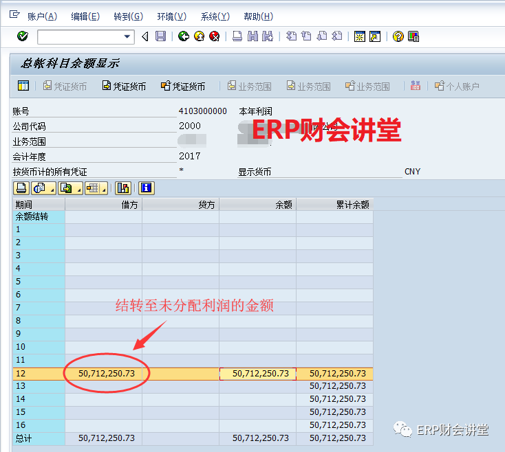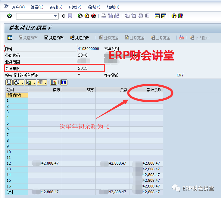 在执行FAGLGVTR结转余额时,SAP会将所有损益类科目的余额,以及“本年利润”科目的余额结转到“本年利润”科目的次年年初余额,由于二者相等,这样“本年利润”科目次年年初余额为0。