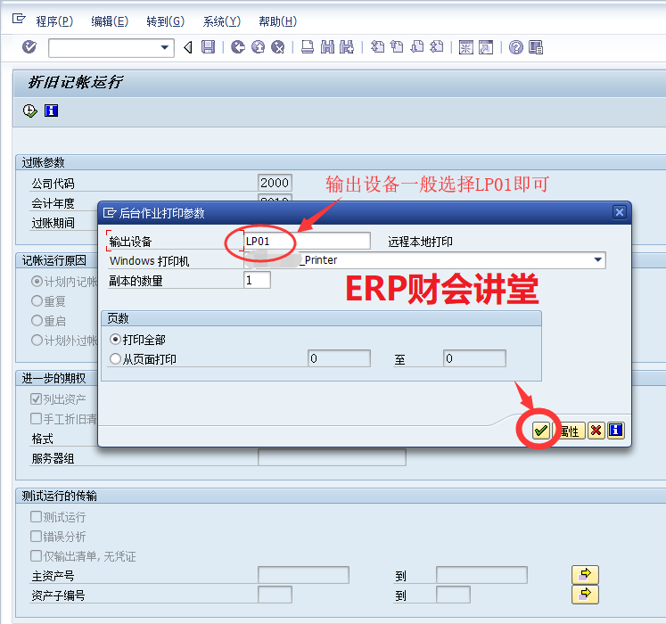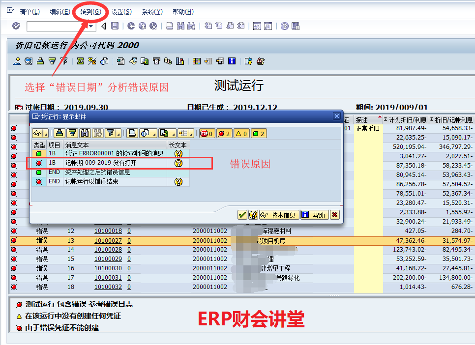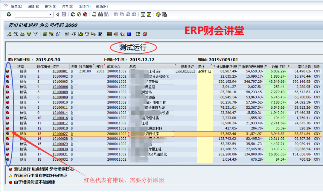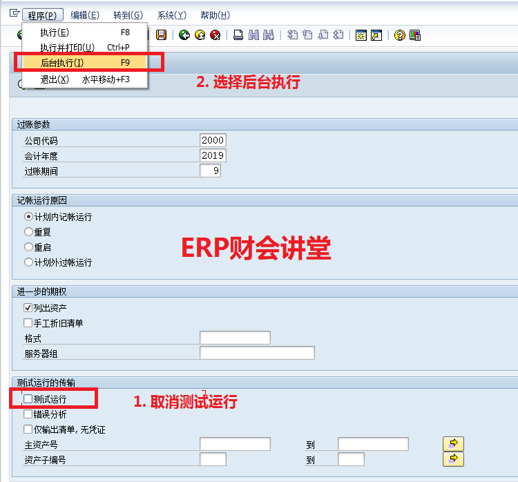 运行资产折旧是财务必备的月度工作,一般在月底执行。SAP中运行资产折旧必须作为后台作业执行,并且可以将其定义为周期性作业,每月最后一天定时执行。本文介绍SAP中运行资产折旧的具体操作。一般测试运行无误后再正式运行,点击红圈中的图标执行测试运行:联机处理时系统默认最多处理1000条数据,如果数据量很大可以后台执行,选择“是”,继续执行。测试运行如果有错误,根据提示选择菜单“转到->错误日志”查看错误原因如下: