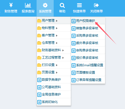 :点晴ERP系统中用户对各个模块的操作权限怎么开启或关闭?![]() 以管理员身份登录ERP系统,找到系统管理-》用户管理-》用户权限维护: