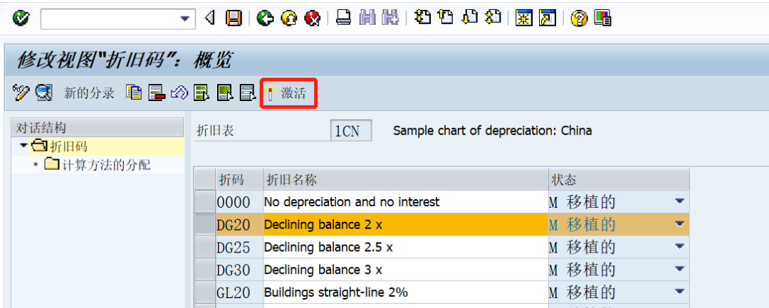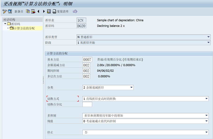 ![]() 备注:新建折旧码可以通过复制现有类似折旧码(如 双击【计算方法分配】切换到计算方法分配下 ![]() 这里可以设置该折旧码的不同折旧阶段(比如,本例设置三个阶段) 阶段1:从折旧开始日开始计算折旧,使用余额递减折旧,当直线折旧法更高时(即使用直线折旧法计算出来的折旧额更高时)切换到下一个阶段。 ![]() 阶段2:在计划使用年限内转换,即当直线折旧法更高时,该折旧码的折旧方法在计划是使用年限内转换为直线法,而在详情页中,我们也可以看到,下一个转换时点为“在使用期结束后进行转换”。 ![]() 阶段3:使用年限结束后转换,即资产使用年限结束后,若还继续使用,则继续使用此处设置的折旧计算方法。 ![]() 可以看到,阶段3仍为直线折旧,切换方式为空(则截止到资产报废,都不会再更换折旧方法)。 最后返回到初始界面激活折旧码 ![]() 点晴模切ERP更多信息:http://moqie.clicksun.cn,联系电话:4001861886 该文章在 2025/4/19 15:04:43 编辑过 |