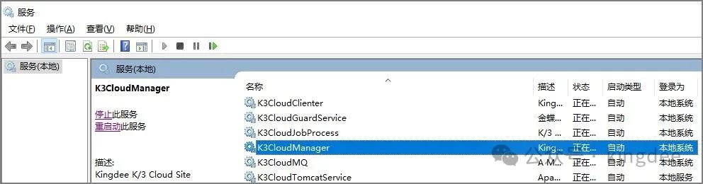 2、补丁安装依赖K3cloudManager服务(环境安装完成后,该服务会自动生成),检查服务器是否正常启动。