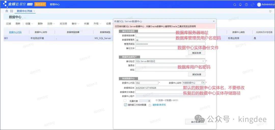 数据库服务器:数据库服务器的ip或者机器名。 数据库管理员用户:能连接数据库服务器的管理账号和密码,一般为sa。 数据库连接用户:能连接数据库服务器的一般账号和密码,可以同数据库管理员用户。 数据库实体:系统自动生成,该实体为管理数据库的数据库实体。 数据库文件路径:数据库实体存放的本地路径,点击搜索按钮会弹出数据库服务器的文件路径,根据自己的需要进行设置。 数据库日志文件路径:日志库存放的路径,默认设置成和数据库文件路径相同。 7、登录管理中心并创建数据中心。 管理库创建完成后,登录管理中心,管理中心登录账号密码默认为:Administrator\888888。