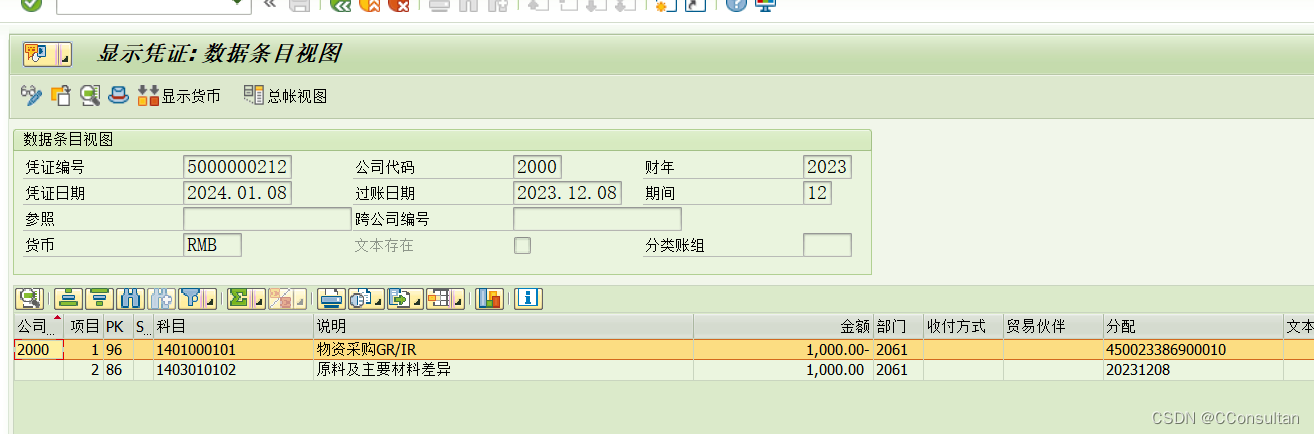再次查看收货会计凭证,发现收货后更改采购订单单价不影响已收货物料的会计凭证