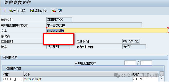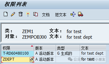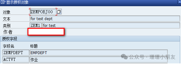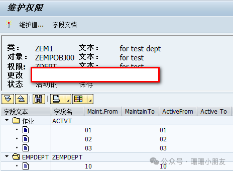 该授权对象包含两个字段,可以在第一个字段 EMPDEPT中输入一 般值'10',第二个字段 ACTVT中,在创建(01)、更改(02)和显示(03)之间进行选择,也就是说,分配这个参数文件的用户,只能对 '10' 部门的数据进行01、02、03操作。也可以设置为“*”这样任何操作都可以通过。