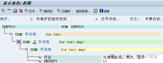 首先,事务码:PFCG 创建角色:ZEMPR00,输入描述文本,点击创建,点击“权限”选项卡,参数文件名称:点击(系统建议的),点‘更改授权数据’->‘手动,输入授权对象:ZEMPOBJ00,回车,保存,然后指定权限的值。