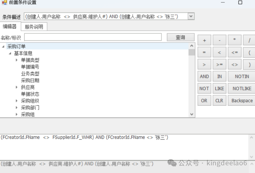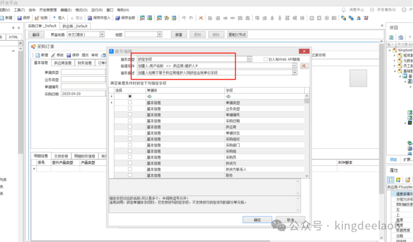 在采购订单表头【供应商】字段增加实体服务规则,供应商维护人与创建人不一致、并且过滤掉可以维护所有价格的用户,则锁定价格字段,由于实体服务规则取不到当前单据的操作人,这里只能使用创建人去满足条件,实体服务规则如下即可实现。
