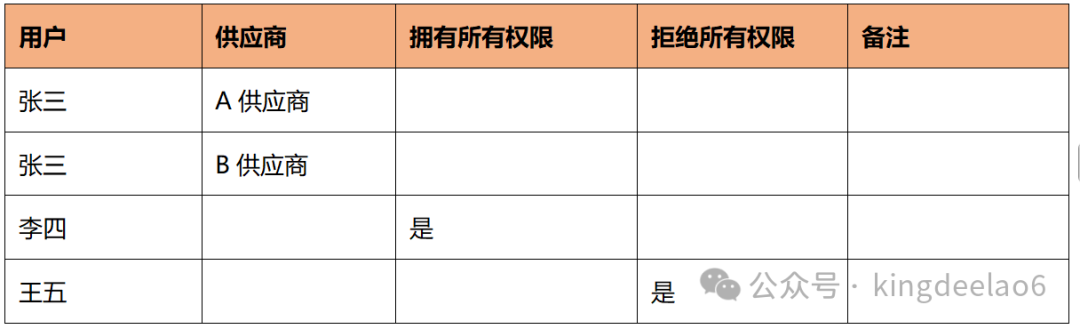 2.用户与供应商的对应关系、用户拥有所有权限、用户拒绝所有权限三者只能维护其一。