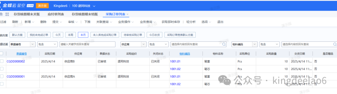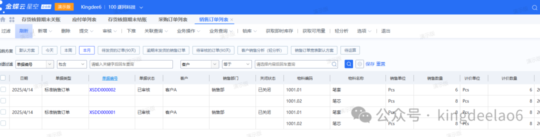 上一节讲了存货核算底层的财务原理,这一节将从云星空系统使用的角度去阐述存货核算的应用,以下是官方系统功能图。系统测试单据:2张采购订单,2张销售订单,生成对应的采购入库单和销售出库单。