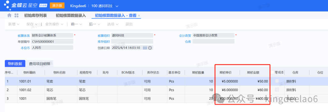 - 填写对应的期初成本单价,这样才有数量和成本金额进行对应。