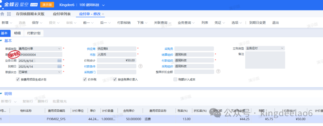 - 出入库单据核算:系统自动进行库存单据的入库出库核算。①这里需要做费用类的应付单,如下图所示,注意需要填写费用项目②选择费用应付单,和相关的库存单据进行相对于的费用分配。