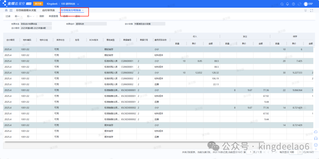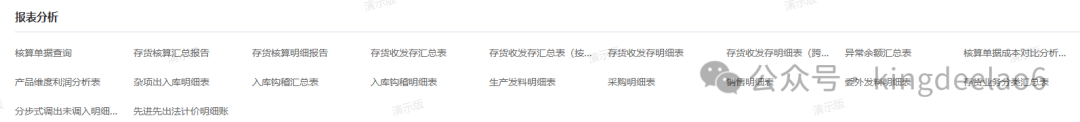 - 存货核算报表分析:系统提供了很丰富的报表进行存货核算分析。存货收发存明细表,可以清楚的看到一笔笔明细存货数量和金额账。