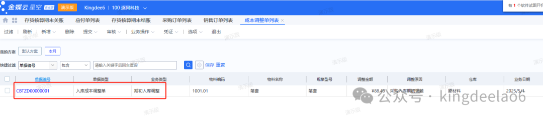 - 存货调整单:各模式下,同一期间不生成成本调整单,需要跨期才能生成成本调整单,以下成本调整单是采购入库单和业务应付单不在同一期间,且金额存在差别,在5月直接生成了成本调整单。
