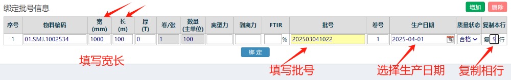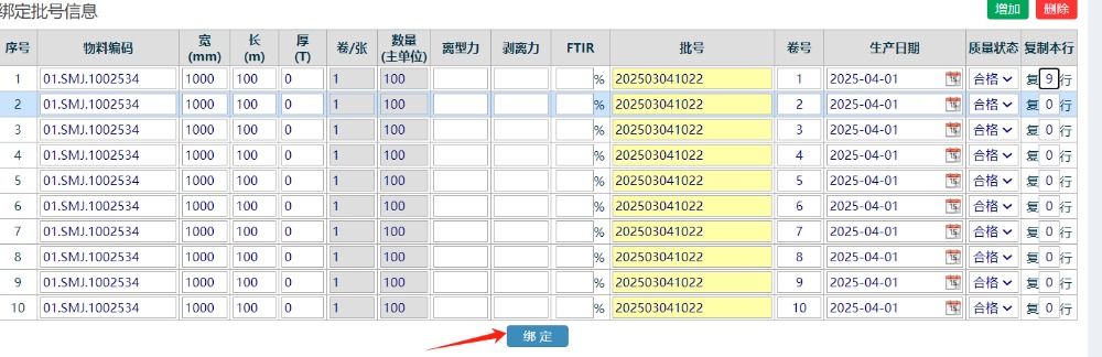 然后在弹出的窗口,填写宽长,批号,生产日期等信息,如果有多卷,则复制多行。 例如有10卷,则在最后一列填上9,则会复制9行,加上第一行则有10行代表10卷材料 如下图: ![]() 最后点击绑定按钮 如下图: