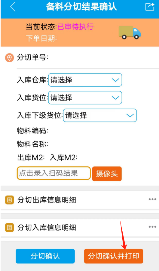 扫分切出库的原材料标签的二维码,把分切好的规格结果录入后,点击分切确认并打印按钮
