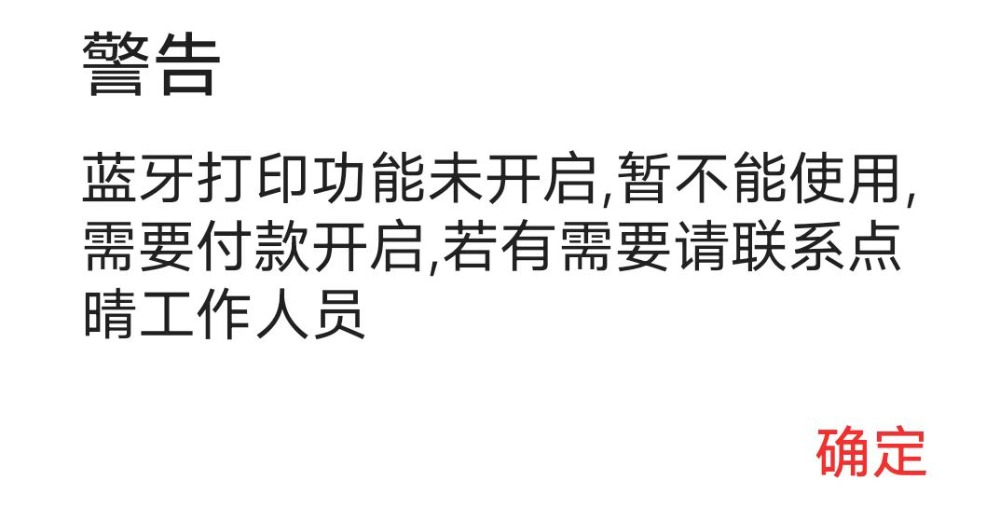 弹出提示:蓝牙打印功能未开启,暂不能使用,需要付款开启,若有需要请联系点晴工作人员