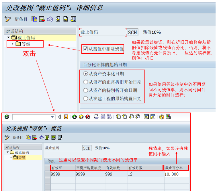 配置路径:IMG->财务会计->资产会计核算->折旧->评估方法->更多设置->定义终值码(ANHAL