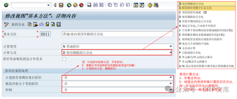 配置路径:IMG->财务会计->资产会计核算->折旧->评估方法->折旧码->计算方法->定义基本方法