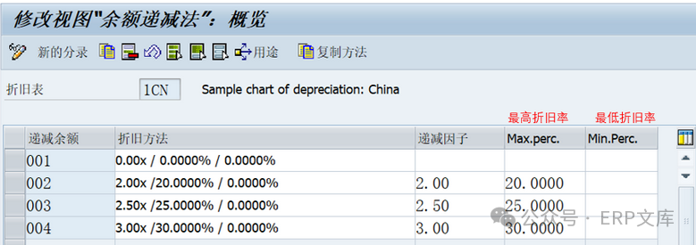 举例说明:资产折旧率为12%,按照双倍余额递减法,则其折旧率为24%,但是此处配置的最大折旧率为20%,则表示该资产最多使用20%去进行折旧。而上图中的001,递减因为为空,则表示按照资产原有折旧率进行折旧。