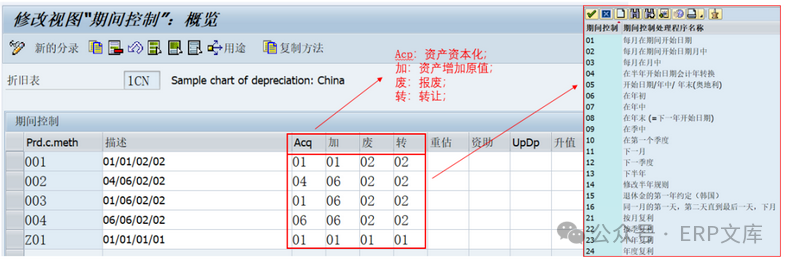 期间控制决定了折旧是从本月开始还是从下月开始。这通常与资产的购置日期有关,以及资产的使用寿命。系统标准配置中通常包括“01”-当月和“11”-下月两个选项。