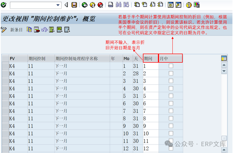 配置路径:IMG->财务会计->资产会计核算->折旧->评估方法->期间控制->定义日历分配(OAVH