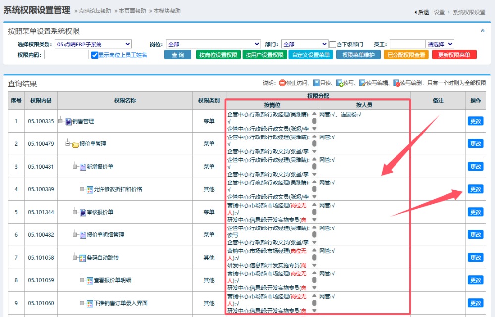 在上面就可以看到各个功能模块和菜单的权限设置情况了, 显示了所有有此权限的岗位及人员,如果与实际不符合,点击后面的操作列“更改”按钮,就可以更改此权限的对应操作岗位和人员了。