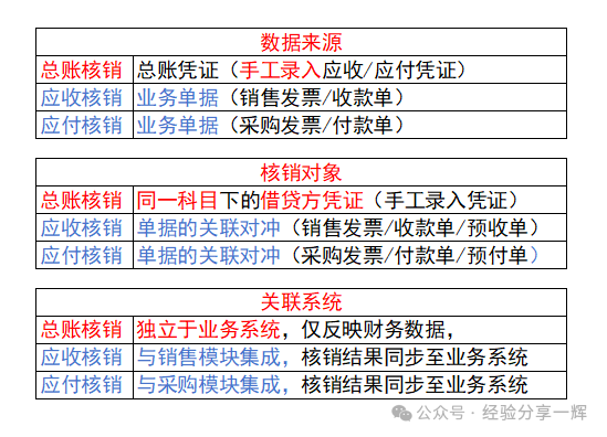 怕大家搞乱了,我们把(总账往来核销)的和(应收应付的往来核销)做个对比。从数据来源核销对象关联系统三个方面来看。
