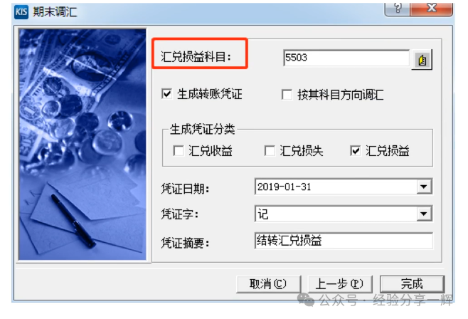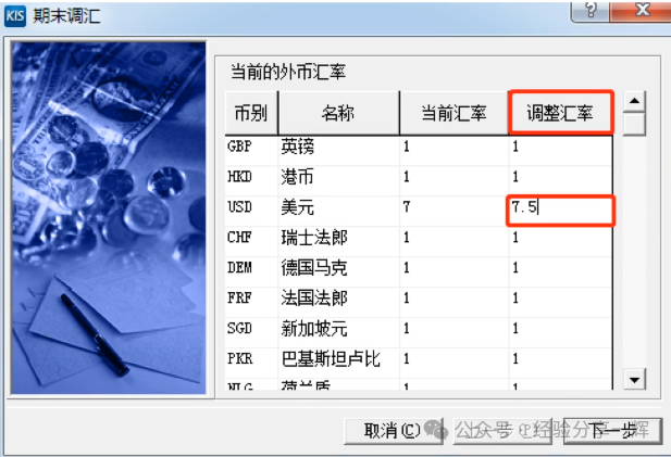 操作:打开期末调汇--输入美元汇率(7.5)--下一步。