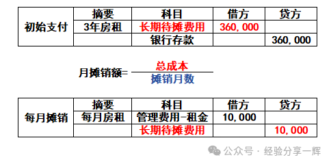 举个例子:预付3年租金36万元,按月摊销1000元。