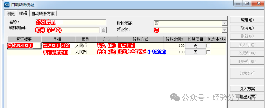 (新增)--创建新模板模板名称:房租分摊转账期间:每月(1-12)凭证字:记;凭证摘要:分推房租费用;科目1:管理费用--租金,借方,转账方式:自动判定。科目2 :长期待摊费用,贷方,转账方式:按固定金额转出(=10000)保存模板。