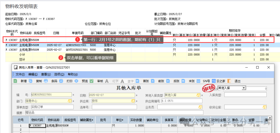 第二行:单据(QIN20250227001),可以双击单据,显示明细;(第二行双击后,出现单据明细:其他入库单