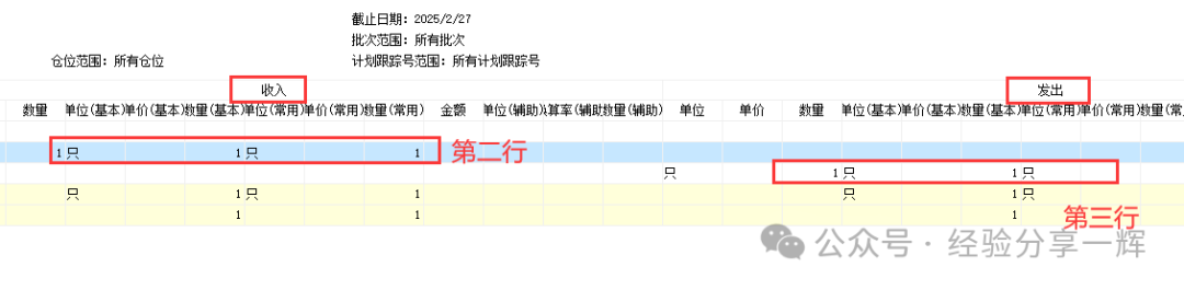 因为明细太长了,向右拉,显示(收入和发出),第二行:收入1只;第三行:发出也是1只